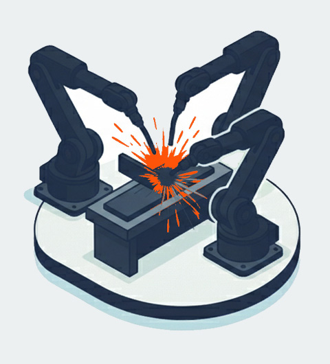 複数台のハンドリングロボットが材料と部品を保持・固定し自動溶接。