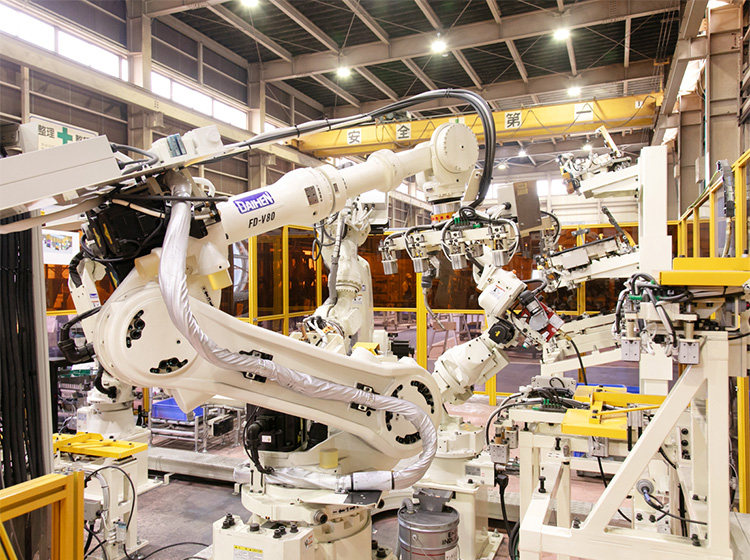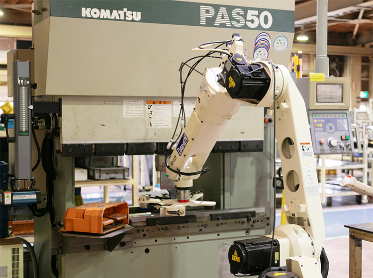 少子高齢化による人出不足に対応するため、プレスブレーキと溶接の重要工程においてロボット技術を導入しています。