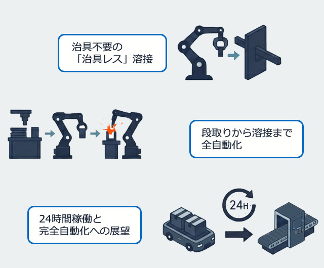 段取り・材料準備・組立溶接作業をすべてロボットが行い、人による介在作業を最小限に。