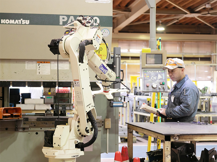少子高齢化による人出不足に対応するため、プレスブレーキと溶接の重要工程においてロボット技術を導入しています。